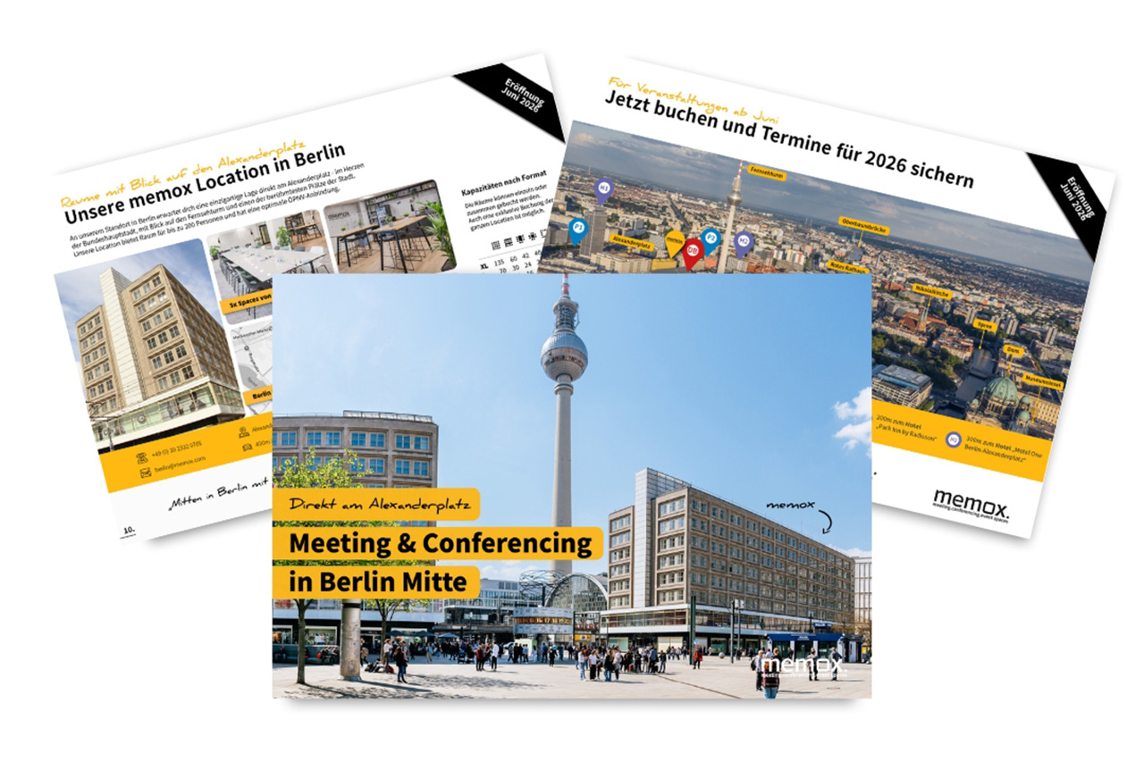 In unserer Location in Berlin erwartet dich ab Juni 2026 eine einzigartige Lage direkt am Alexanderplatz - im Herzen der Bundeshauptstadt, mit Blick auf den Fernsehturm und einen der berühmtesten Plätze der Stadt. Die insgesamt fünf Räume bieten Platz für bis zu 200 Personen. Durch die zentrale Lage sowie die zahlreichen Parkmöglichkeiten und ÖPNV‑Anbindungen in unmittelbarer Nähe ist unsere Location in Berlin ideal für deine Teilnehmenden erreichbar.