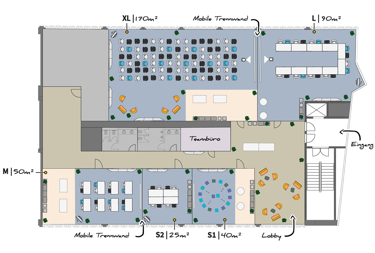 Auf insgesamt 640 m² erwarten dich 5 unterschiedliche Räume von 25-170 m². Alle Räume sind einzeln oder auch kombiniert buchbar. Durch mobile Trennwände bietet unsere Location maximale Flexibilität: So lassen sich XL- und L-Space zu einem 260 m² großen Raum verbinden, während sich M- und S2-Space zu einem 75 m² Raum kombinieren lassen. Unser erfahrenes Team in Berlin entwickelt anhand deiner Anforderungen und Wünsche ein individuelles Raumlayout für deine Veranstaltung - dieser Service ist bei memox immer kostenlos.